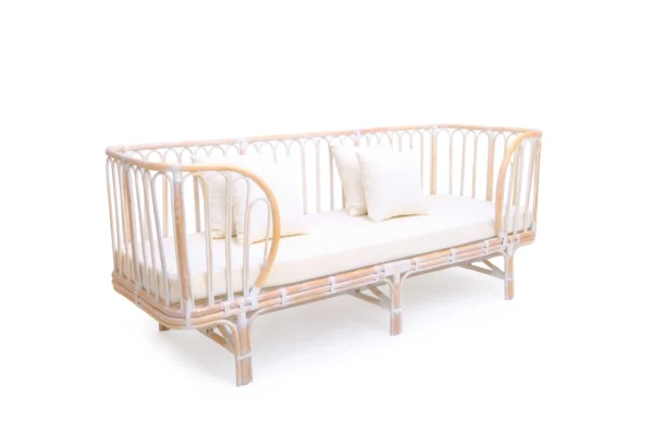 Designed with versatility in mind, this Paris rattan sofa serves multiple purposes. During the day, it functions as an elegant sofa, providing ample seating space for relaxation or socializing with loved ones. As night falls, it effortlessly transforms into a cozy daybed, inviting you to unwind and indulge in supreme comfort. Our Rattan Couch boasts exceptional craftsmanship, skillfully handwoven by our expert artisans. The intricate weaving pattern adds an element of sophistication, creating an alluring centerpiece that exudes both charm and durability. The white wash finish further accentuates the natural beauty of rattan, infusing a touch of modernity into its traditional design. With its removable cushion and pillow featuring a convenient zipper, comfort and style merge seamlessly to create a truly irresistible furniture piece. Our Rattan Daybed is crafted exclusively for indoor use, making it an ideal choice for living rooms and family rooms.